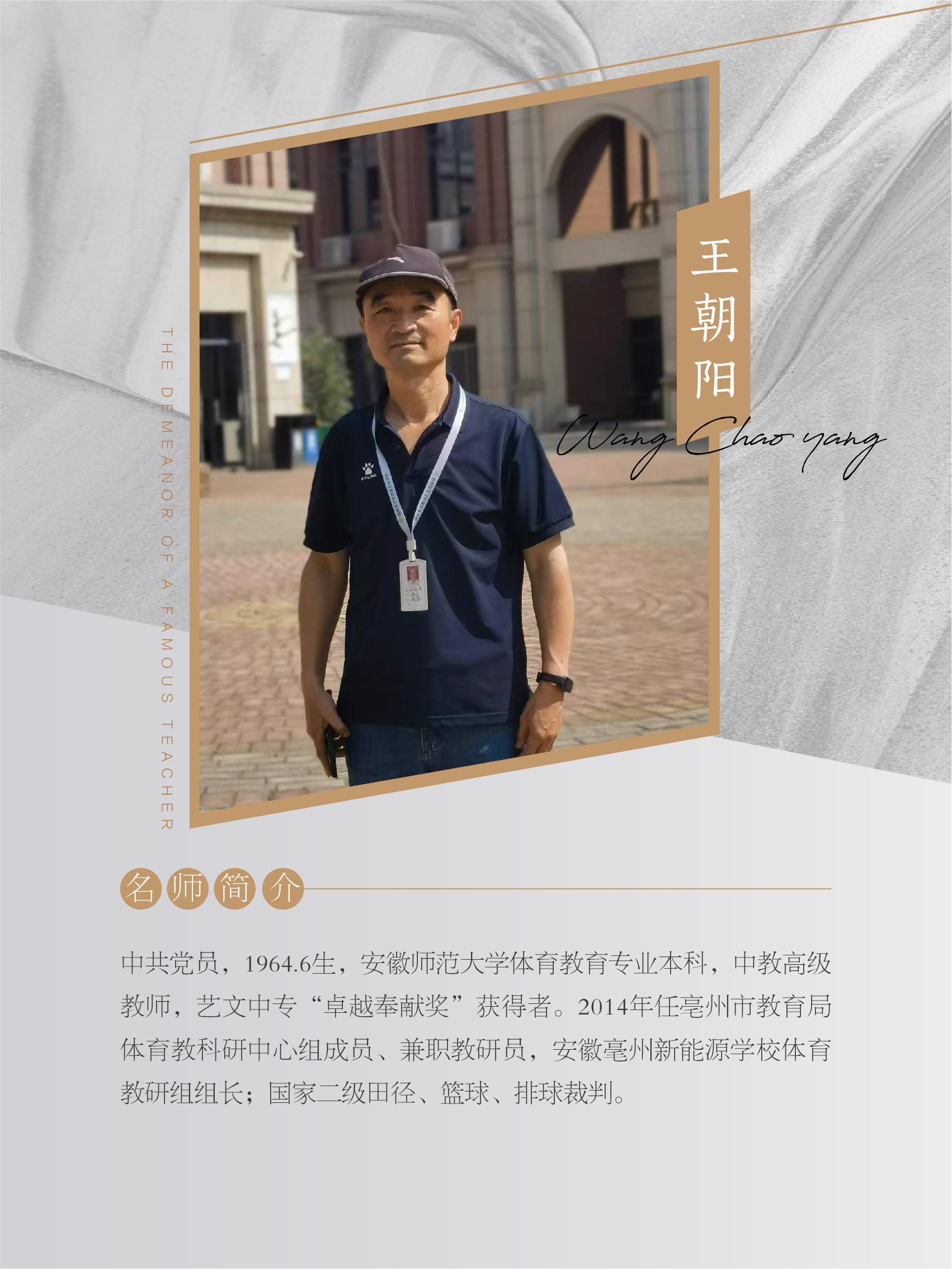 王朝陽(yáng)老師2023年從安徽亳州新能源學(xué)校退休,滿懷對(duì)教育事業(yè)的熱愛(ài),加入宿州市藝文中等專(zhuān)業(yè)學(xué)校,擔(dān)任體育課教學(xué)至今,承前啟后傳幫帶,為國(guó)家培養(yǎng)體育專(zhuān)業(yè)人才。