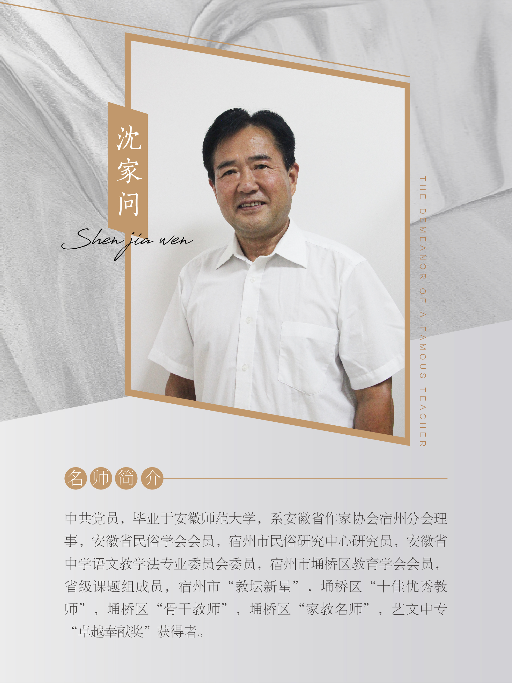 作為一名教師,在平凡的崗位上,他耕耘著一份赤誠(chéng),播撒著一腔熱血,收獲著一份希望與感動(dòng)。教書(shū)育人,無(wú)私奉獻(xiàn),是他畢生的追求。從教四十年,他多次被評(píng)為先進(jìn)教師、優(yōu)秀黨員,曾獲得全國(guó)“教科研先進(jìn)個(gè)人”、全國(guó)“基礎(chǔ)教育課程改革先進(jìn)個(gè)人”、宿州市“教壇新星”,埇橋區(qū)“十佳優(yōu)秀教師”等稱號(hào),發(fā)表文學(xué)作品、教育教學(xué)論文二十余萬(wàn)字,三次獲得政府文學(xué)獎(jiǎng)。他,就是沈家問(wèn)老師。