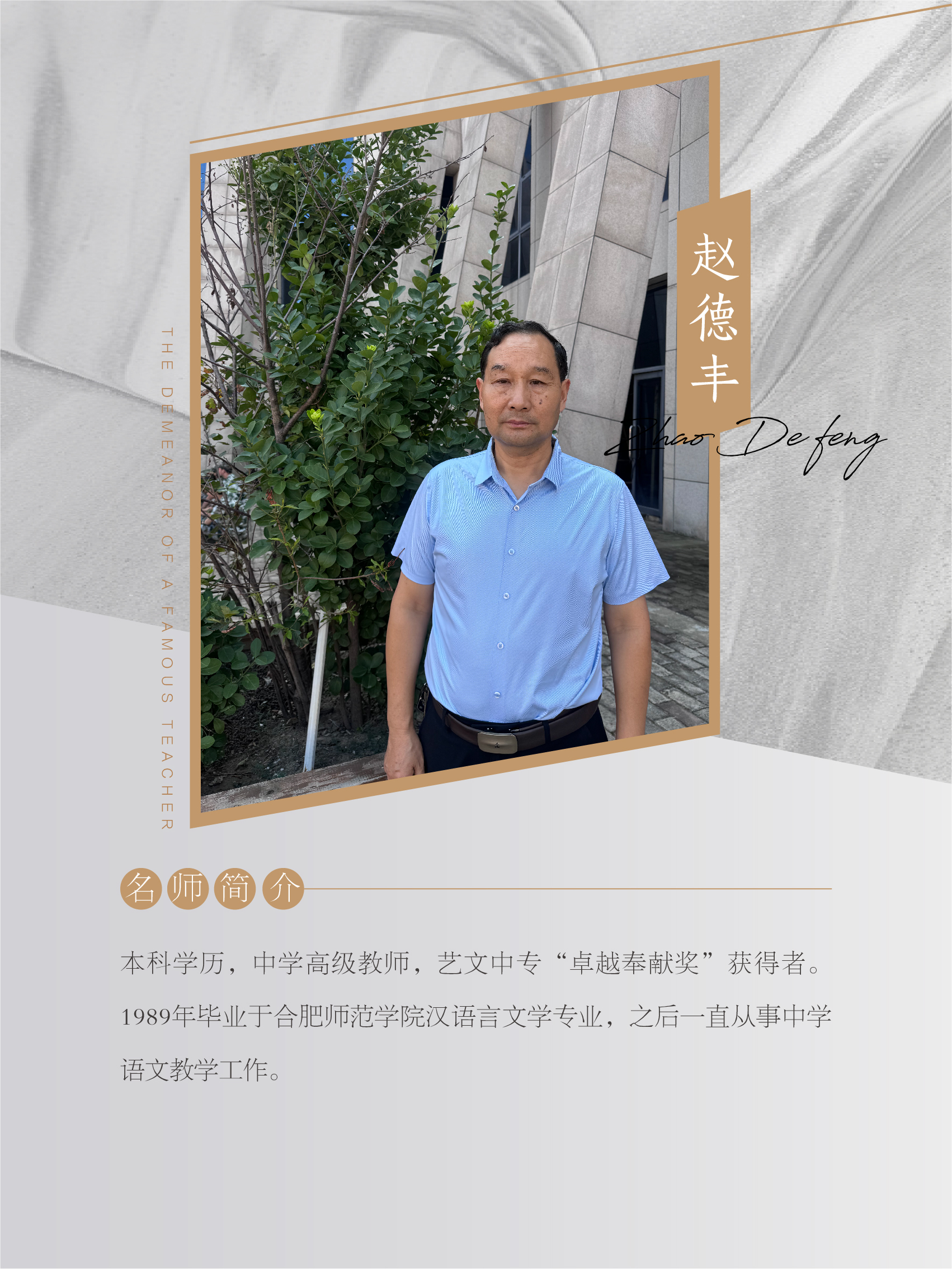 趙德豐,本科學(xué)歷,中學(xué)高級(jí)教師,1989年畢業(yè)于合肥師范學(xué)院漢語(yǔ)言文學(xué)專(zhuān)業(yè),之后一直從事中學(xué)語(yǔ)文教學(xué)工作。