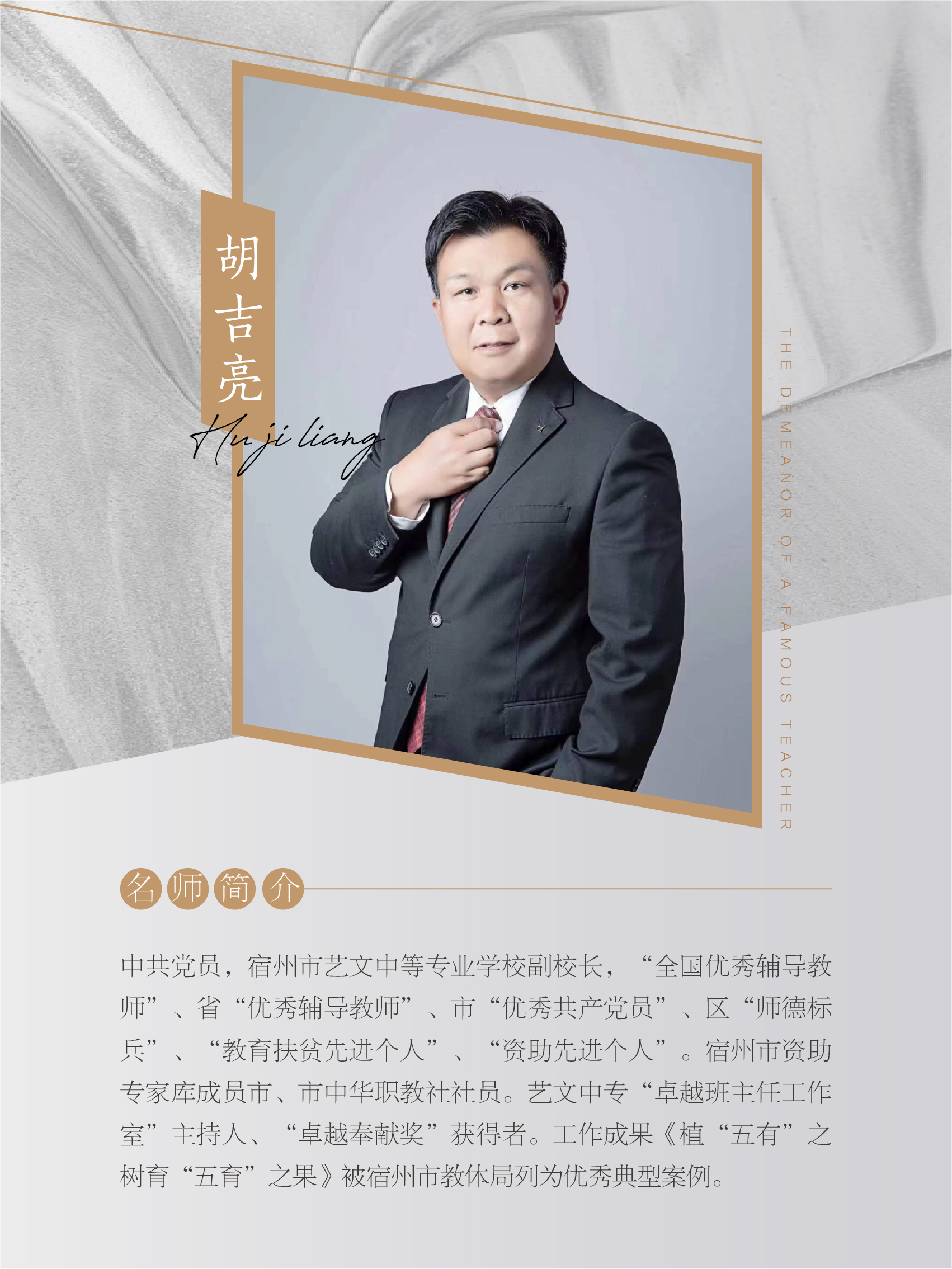 胡吉亮,男,現(xiàn)年43歲,宿州市“優(yōu)秀共產(chǎn)黨員”宿州市藝文中專學(xué)校副校長、食品安全總監(jiān),班主任。20年的教育生涯,他以卓越的業(yè)績和無私的奉獻(xiàn)精神,樹立了一個(gè)優(yōu)秀教師的標(biāo)桿。