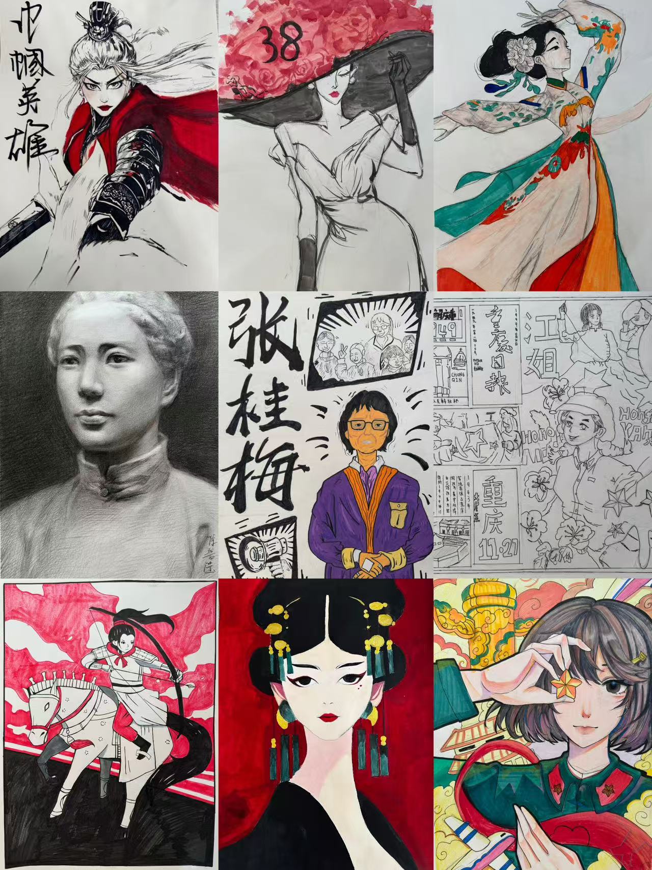 繪畫專業(yè)學(xué)生以“巾幗英雄”為主題創(chuàng)作系列海報,生動刻畫革命歷史與現(xiàn)代職場中的女性形象。同時專題展區(qū)集中展示我校女性教師的教學(xué)成果、公益行動事跡,全面彰顯“她力量”的紅色底蘊與時代風(fēng)采。