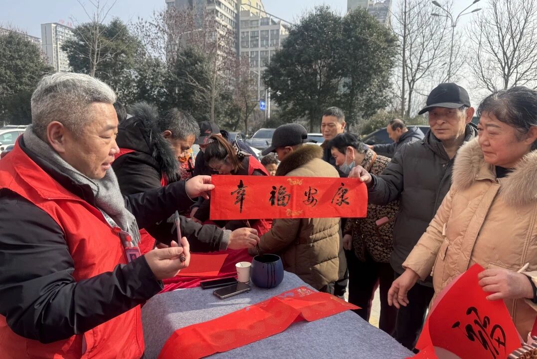活動(dòng)現(xiàn)場墨香四溢,氣氛熱烈。我校書法特長的教師們鋪開紅紙,揮毫潑墨,一幅幅工整雋永的春聯(lián)、一個(gè)個(gè)飽滿雄渾的“福”字迅速呈現(xiàn)。“天增歲月人增壽,春滿乾坤福滿門”等傳統(tǒng)佳句寄托著吉祥寓意,除此之外,師生們還貼心地為居民提供個(gè)性化定制服務(wù),根據(jù)居民的姓名、家庭心愿,量身打造專屬春聯(lián),讓每一副春聯(lián)都充滿專屬的溫暖與心意。居民們一邊欣賞書法創(chuàng)作,一邊排隊(duì)領(lǐng)取,拿到親手書寫的春聯(lián)和福字,大家臉上都洋溢著幸福的笑容,不住地稱贊:“手寫的春聯(lián)才有年味兒,藝文學(xué)校的師生們寫得真好,太貼心了!”墨香纏繞著年味,溫情浸潤著人心,整個(gè)廣場都沉浸在喜慶祥和的新春氛圍里。