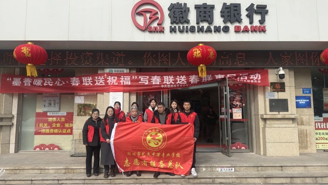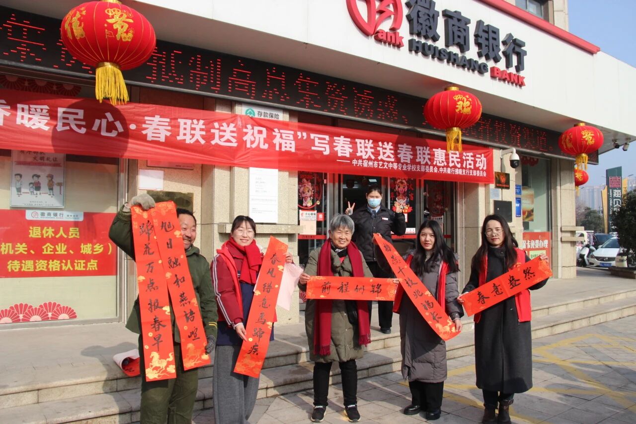 筆墨傳情迎新春,黨建惠民暖人心。為深入踐行黨建引領(lǐng)服務(wù)群眾理念,傳承中華優(yōu)秀傳統(tǒng)文化,2026年2月3日,中共宿州市藝文中等專業(yè)學(xué)校支部委員會(huì)攜手徽行拂曉支行黨支部,在徽行拂曉支行門前廣場舉辦“墨香暖民心·春聯(lián)送祝福”惠民活動(dòng),以筆墨為媒,為屬地居民送上最真摯、最溫暖的新春問候。