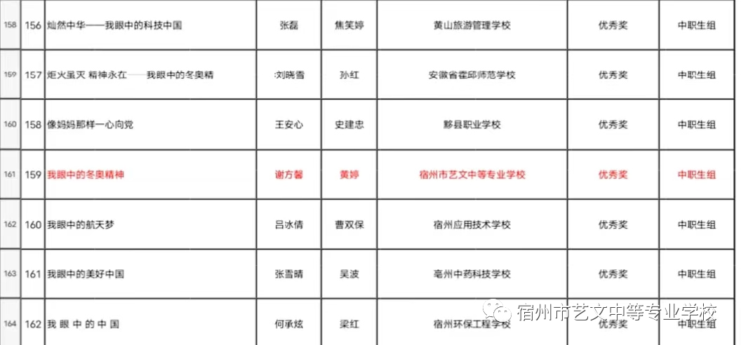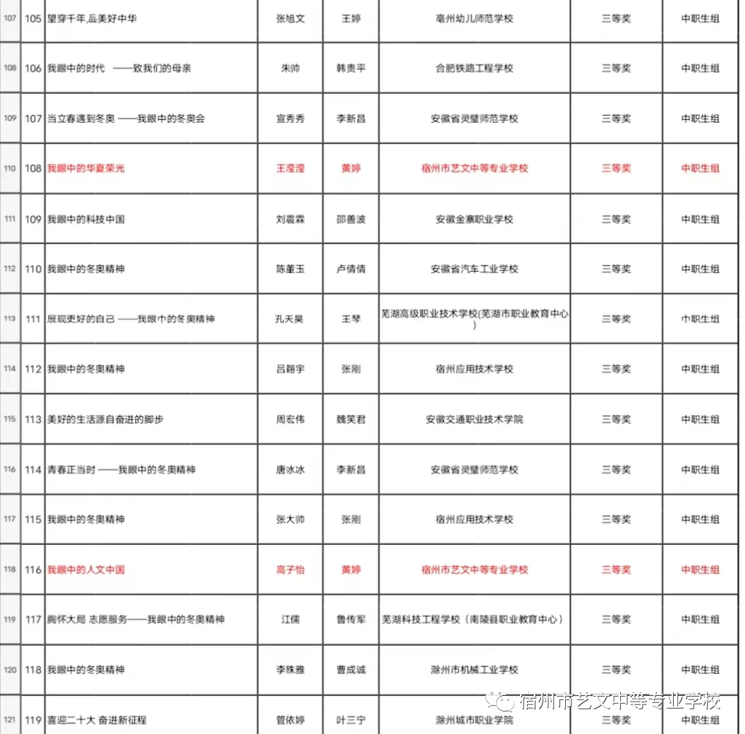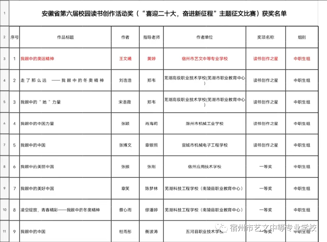 藝文學(xué)校于安徽省第六屆校園讀書(shū)創(chuàng)作活動(dòng)(“喜迎二十大,奮進(jìn)新征程”主題征文比賽)中再獲佳績(jī)!本次活動(dòng)共七名師生獲得佳績(jī),其中潘為富老師作品《我們這十年》榮獲教師組優(yōu)秀獎(jiǎng),王文曦同學(xué)作品《我眼中的奧運(yùn)精神》榮獲中職生組讀書(shū)創(chuàng)作之星,名列全省五名創(chuàng)作之星之首,戴楊盼同學(xué)作品《我眼中的中華魅力》榮獲中職生組二等獎(jiǎng),王瀅瀅同學(xué)作品《我眼中的華夏榮光》、高子怡同學(xué)作品《我眼中的人文中國(guó)》榮獲中職生組三等級(jí),謝方馨同學(xué)作品《我眼中的冬奧精神》、魏佳妮同學(xué)作品《我眼中的冬奧精神》榮獲中職生組優(yōu)秀獎(jiǎng),指導(dǎo)老師黃婷。