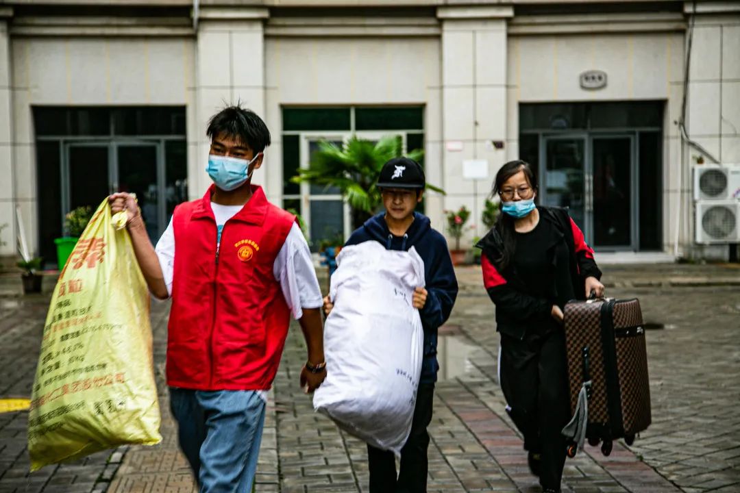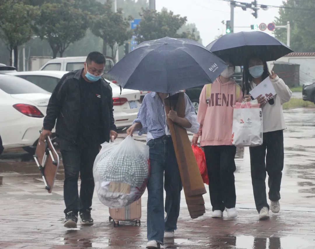 即使天氣微涼,天空中下著小雨,也仍然擋不住學(xué)生們期待的心情。校門剛剛打開,學(xué)生和家長們就拎著大包小包陸續(xù)到來了。