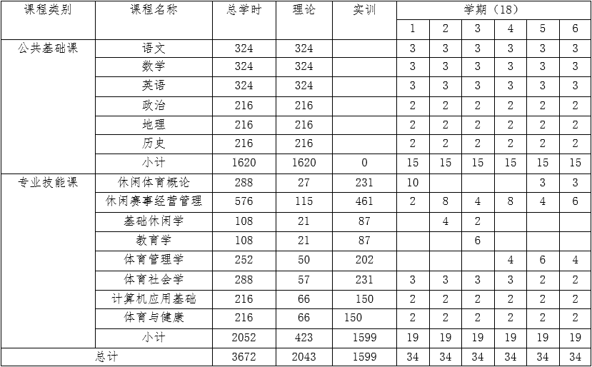 四、休閑體育服務與管理專業(yè)教學時間安排
